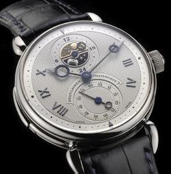 Ausgestattet mit ausgeklügelten Mechanismen, die für das Kaliber " minute repetition movement" entwickelt wurden und die Stunden, die zig Minuten und die Minuten erklingen lassen, integriert diese Kreation eine Komplikation zusätzlich auf Wunsch eines Privatkunden entwickelt. Das Masterpiece 7 erbt die vorteilhafte Position der kleinen Sekunde bei 6 Uhr und wird mit einer 24-Stunden-Anzeige in einer neuen Zeitzone um 12 Uhr ergänzt. Dieses Tag-Nacht-Zifferblatt mit eingravierten stilisierten Figuren, die Sonne und Mond symbolisieren, besteht aus Weißgold und 18 Karat Gelbgold. Der Mechanismus wird durch die Aufzugskrone betätigt, die nur leicht gedrückt werden kann, um diese zweite Zeitzone um eine Stunde vorzurücken.